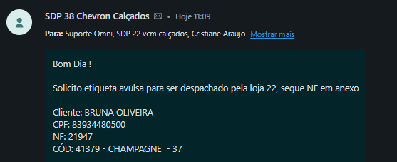 OBS: Em casos de pedidos contendo apenas 1 produto e sendo da transportadora Correio, ao enviar e-mail pode enviar a etiqueta que a loja tem acesso na Intelipost, apenas para a transportadora "CORREIO".