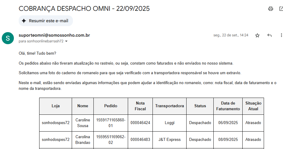 É primordial o retorno da loja no e-mail, informando o caso de cada cliente, pois não podemos deixar um pedido por muito tempo aguardando o envio, isso impacta diretamente na experiência das nossas clientes de forma negativa.